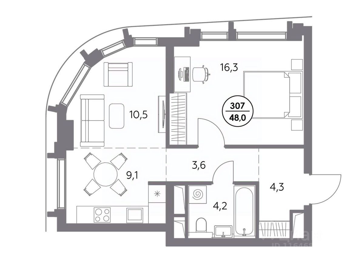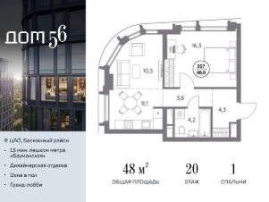 В премиум-квартале "Дом 56" на Бауманской напрямую от девелопера ГК "Галс-Девелопмент" представлена 1-комнатная квартира на 20 этаже общей площадью 48.00 м².