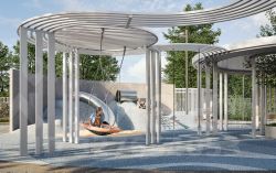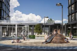 Во внутреннем приватном дворе будет создано пространство в бионическом стиле с лаунж-зонами, подвесными качелями, детскими плейхабами для разных возрастов, площадками для спорта и отдыха в окружении зелени.