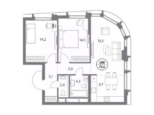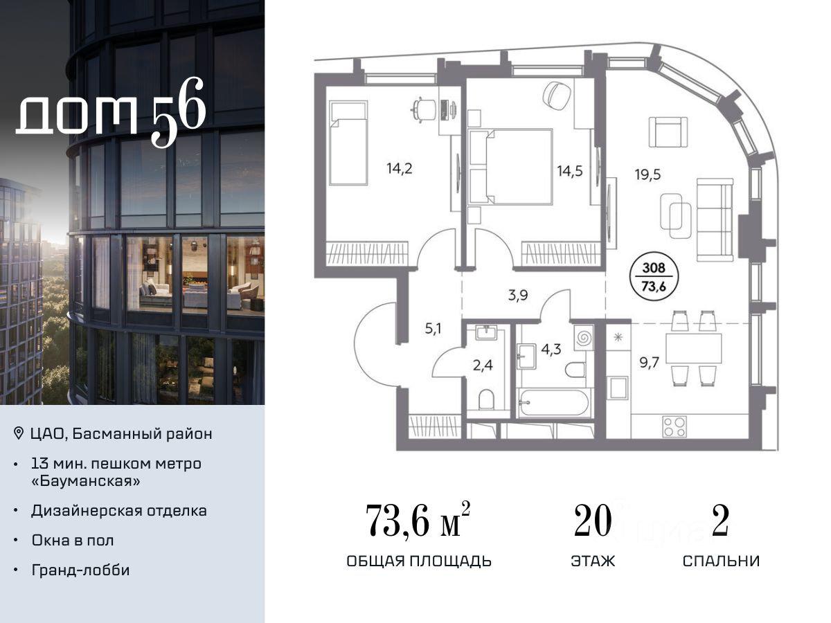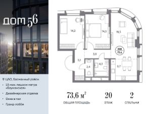 В премиум-квартале "Дом 56" на Бауманской напрямую от девелопера ГК "Галс-Девелопмент" представлена 2-комнатная квартира на 20 этаже общей площадью 73.60 м².