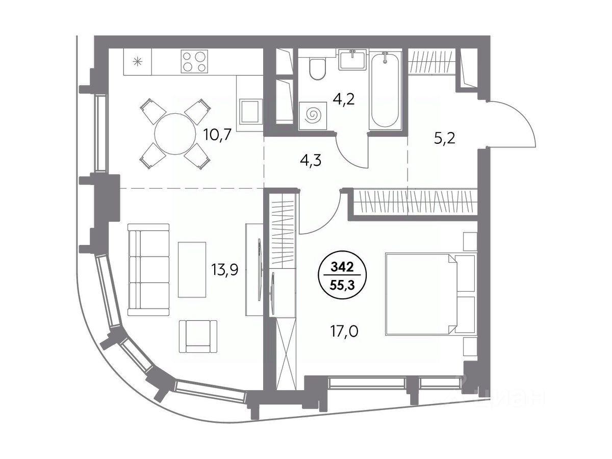 В премиум-квартале "Дом 56" на Бауманской напрямую от девелопера ГК "Галс-Девелопмент" представлена 1-комнатная квартира на 24 этаже общей площадью 55.30 м².