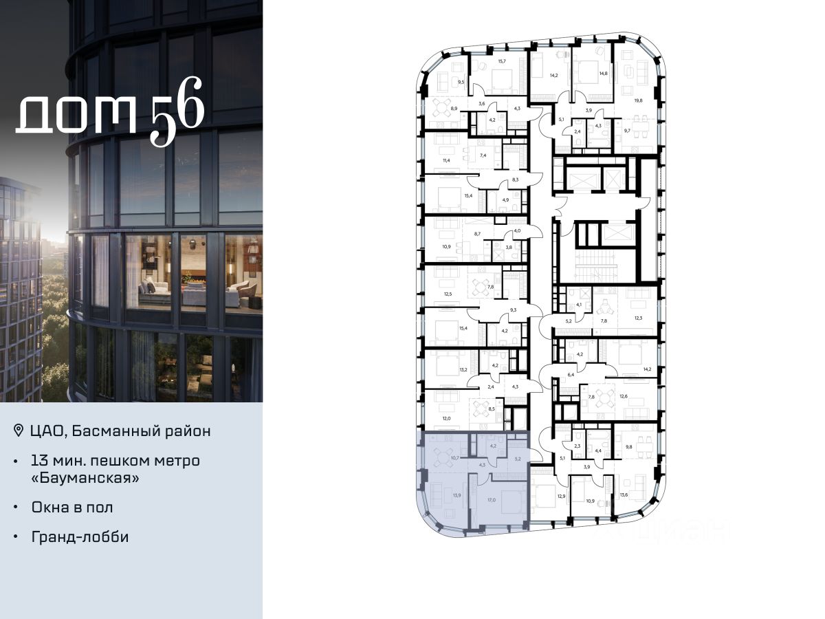 "Дом 56" - расположен в Басманном районе на ул. Фридриха Энгельса, всего в 12-15 минутах пешком от станций метро "Бауманская" и "Электрозаводская".