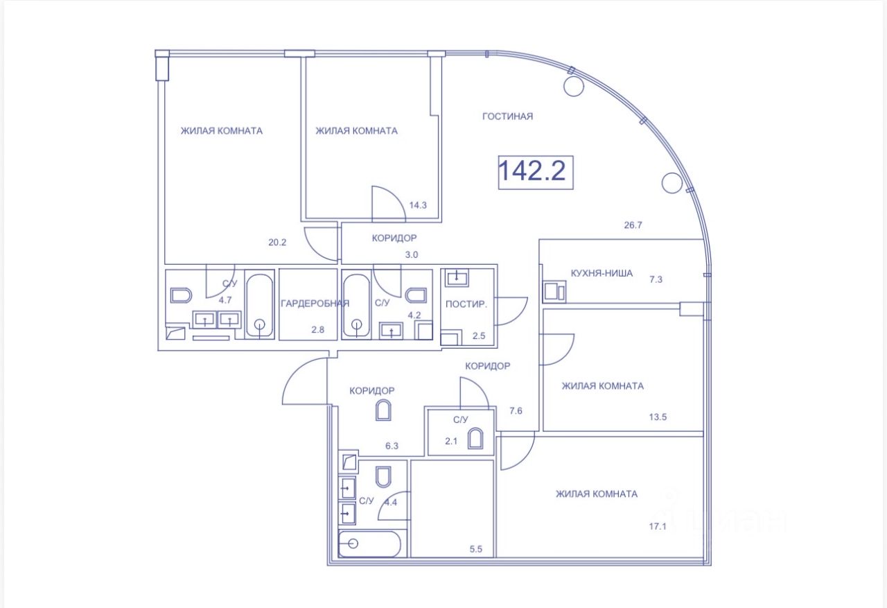 Четыре изолированные комнаты подходят для организации спален, детских, кабинета: они гарантируют приватность и комфорт, дают возможность создать уютные зоны отдыха или рабочую атмосферу.