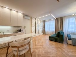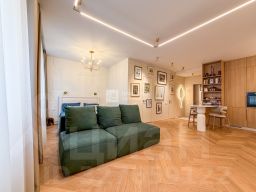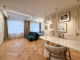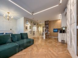 -Дизайнерский ремонт выполнен с использованием качественных материалов и стильных решений.