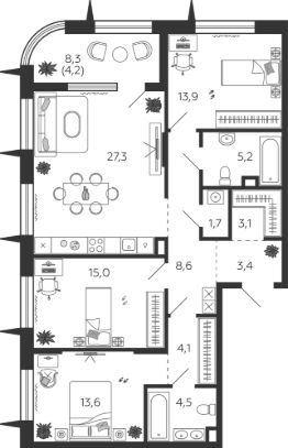 Продаётся 3-комнатная квартира в сданном доме (Корпус 1 (2 очередь 2 этап)), срок сдачи: I-кв. 2026, общей площадью 104.3 кв.м., на 2 этаже. Это город в городе, который не подстраивается под старые рамки, а задает новую планку и стандарт жилого района в России.