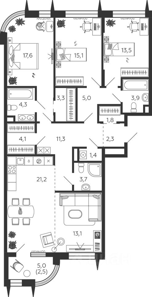 Продаётся 4-комнатная квартира в сданном доме (Корпус 1 (2 очередь 2 этап)), срок сдачи: I-кв. 2026, общей площадью 123.8 кв.м., на 3 этаже. Это город в городе, который не подстраивается под старые рамки, а задает новую планку и стандарт жилого района в России.