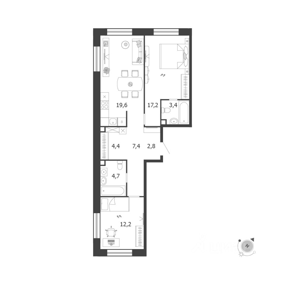 Продаётся 2-комнатная квартира в строящемся доме (Корпус 9 (3 очередь)), срок сдачи: IV-кв. 2026, общей площадью 71.7 кв.м., на 12 этаже. Это город в городе, который не подстраивается под старые рамки, а задает новую планку и стандарт жилого района в России.