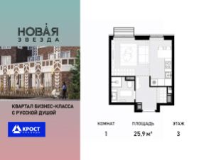 Продаётся 1-к квартира 25.9 кв.м. на 3-м этаже 22 этажного дома, корпус 2 - Резиденция "Сочи" . Без отделки.