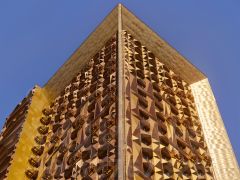 Здание состоит из двух объемов, один из которых сдвинут относительного другого в горизонтальной плоскости.