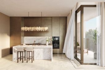 Интерьер создан 1508 London — британским бюро, чьи проекты украшают резиденции по всему миру. В этой квартире всё говорит о сдержанной роскоши: тёплый оттенок дубовой инженерной доски с уникальной раскладкой, текстильные обои и панели из натурального шпона на стенах; дровяной камин как центр гостиной; итальянская кухня Boffi, исполненная по индивидуальному со встроенной техникой Gaggenau; ванная как личное спа: натуральный мрамор, сантехника Antonio Lupi / CEA, баланс текстур и света.
