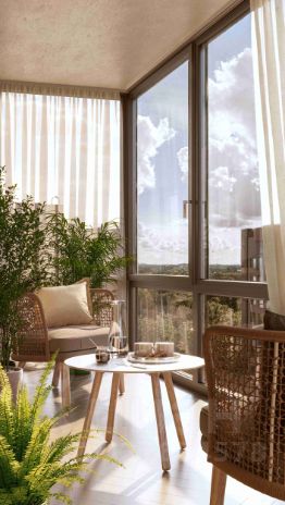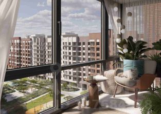 Комплекс включает пять монолитных девятиэтажных домов с выразительным дизайном: бионические фасады, панорамное остекление, теплая цветовая гамма. На первых этажах коммерческие помещения, подземный паркинг. Входные группы и зоны общего пользования гармонично дополняют стиль проекта.