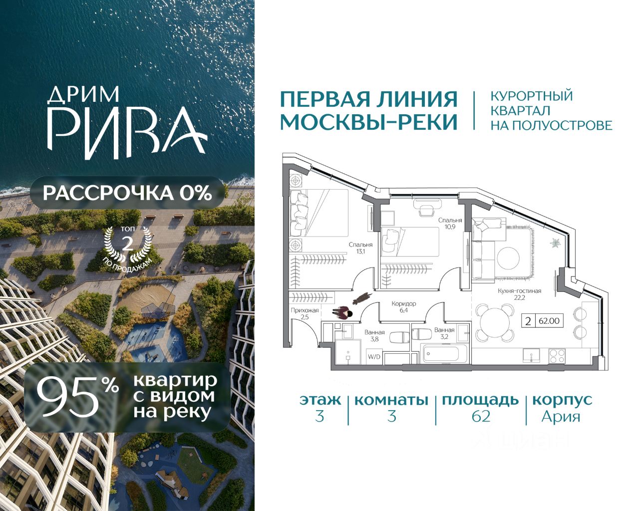 Квартира в премиальном квартале Dream Riva — первая линия Москвы-реки Продается квартира в прибрежном квартале Dream Riva на территории курортной локации "Остров мечты". 62 кв.м, 3 комнат, 3 этаж. Высота потолков 3,1 м. Жемчужная коллекция • Угловые панорамные окна на 270 — редкий формат для проекта • Квартиры с идеальными видом на воду • Мастер-спальня с гардеробной • Естественный свет в гостиной с двух сторон ЛОКАЦИЯ И ТРАНСПОРТ • 15 минут на авто до Садового кольца, • 30 минут до Москва-Сити и Кремля. • 10 минут до метро "Технопарк" в пешей доступности. В перспективе — станция "Остров мечты" (2028г.). ИНФРАСТРУКТУРА КВАРТАЛА • 3 Га приватного двор-парка с зонами для спорта, йоги и отдыха; • Благоустроенная набережная с гастропроменадом; • Клубные лобби с инфраструктурой; • Премиум SPA-центр с бассейном и фитнес-клуб; • Государственный детский сад под окном и школа в 10 минутах от квартала; • Подземный и гостевой паркинг. ПРИВИЛЕГИИ РЕЗИДЕНТОВ • Пляжный клуб Dream Beach Club; • Яхт-клуб Dream Marine Resort; • Вейк-клуб; • Парк развлечений "Остров мечты"; • 44 Га парков для прогулок и спорта в окружении квартала. БЕЗОПАСНОСТЬ И КОМФОРТ • Приватная территория; • Охрана; • Видеонаблюдение; • Консьерж-сервис 24/7; • Современные инженерные системы и технологии умного дома. НАДЕЖНЫЙ ЗАСТРОЙЩИК Regions Development — успешная девелоперская компания. За 20 лет работы реализовали уже более 30 проектов в сегментах коммерческой и многофункциональной недвижимости. Скидки действуют только при 100% оплате и ипотеке Скидки действуют только при 100% оплате, ипотеке и рассрочке. Скидки и акции не суммируются. Звоните, чтобы договориться о просмотре!