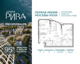 Квартира в премиальном квартале Dream Riva — первая линия Москвы-реки Продается квартира в прибрежном квартале Dream Riva на территории курортной локации "Остров мечты". 64.4 кв.м, 3 комнат, 3 этаж. Высота потолков 3,1 м. • 95% квартир Жемчужной коллекции смотрят на воду • Мастер-спальня с гардеробной • Естественный свет в гостиной с двух сторон ЛОКАЦИЯ И ТРАНСПОРТ • 15 минут на авто до Садового кольца, • 30 минут до Москва-Сити и Кремля. • 10 минут до метро "Технопарк" в пешей доступности. В перспективе — станция "Остров мечты" (2028г.). ИНФРАСТРУКТУРА КВАРТАЛА • 3 Га приватного двор-парка с зонами для спорта, йоги и отдыха; • Благоустроенная набережная с гастропроменадом; • Клубные лобби с инфраструктурой; • Премиум SPA-центр с бассейном и фитнес-клуб; • Государственный детский сад под окном и школа в 10 минутах от квартала; • Подземный и гостевой паркинг. ПРИВИЛЕГИИ РЕЗИДЕНТОВ • Пляжный клуб Dream Beach Club; • Яхт-клуб Dream Marine Resort; • Вейк-клуб; • Парк развлечений "Остров мечты"; • 44 Га парков для прогулок и спорта в окружении квартала. БЕЗОПАСНОСТЬ И КОМФОРТ • Приватная территория; • Охрана; • Видеонаблюдение; • Консьерж-сервис 24/7; • Современные инженерные системы и технологии умного дома. НАДЕЖНЫЙ ЗАСТРОЙЩИК Regions Development — успешная девелоперская компания. За 20 лет работы реализовали уже более 30 проектов в сегментах коммерческой и многофункциональной недвижимости. Скидки действуют только при 100% оплате и ипотеке Скидки действуют только при 100% оплате, ипотеке и рассрочке. Скидки и акции не суммируются. Звоните, чтобы договориться о просмотре!