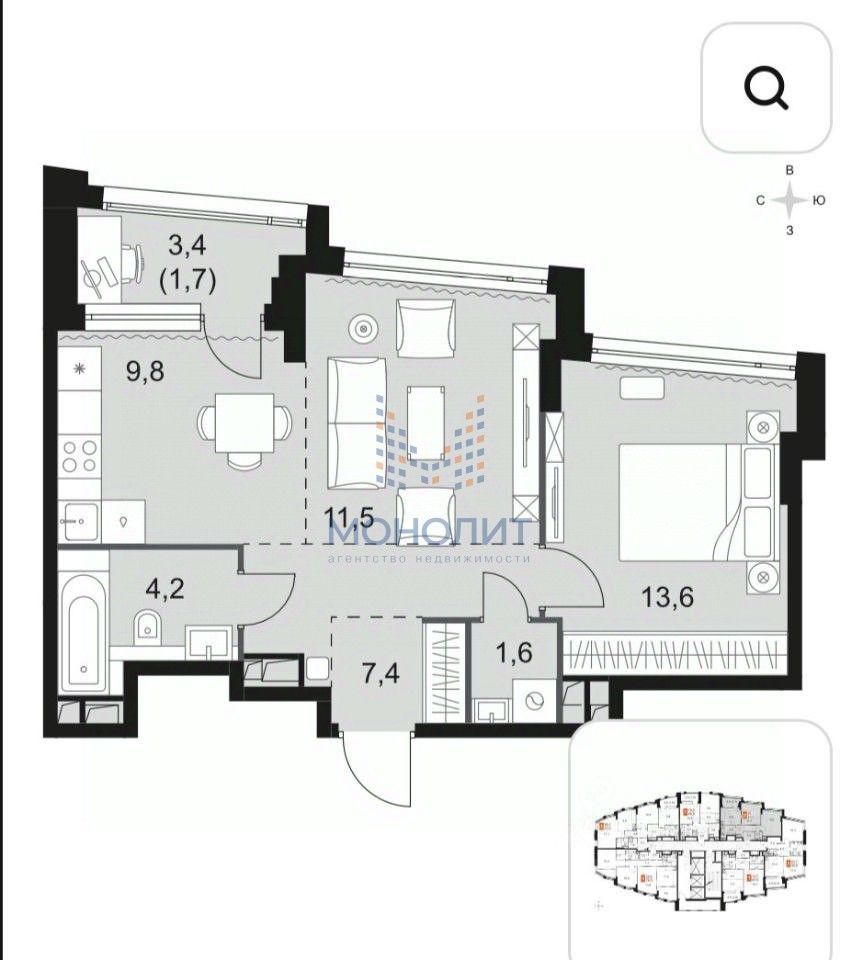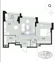 Общая площадь-51,5м2, Жилая-49,8м2, Кухня-9,8м2, лоджия-1,7, сан узел совмещённый.