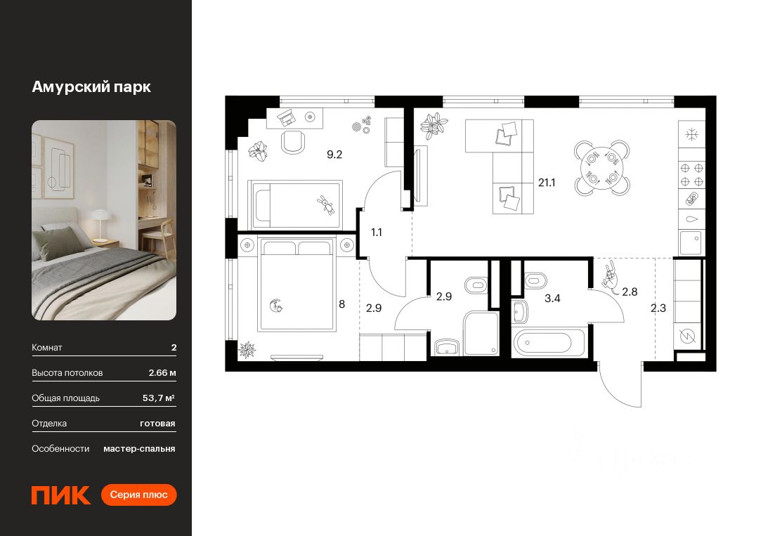 Продаётся 2-комн. квартира площадью 53,7 кв.м на 10 этаже 27 этажного дома (Корпус 4.5, Секция 6) проекта ПИК Амурский парк. Светлый просторный подъезд на уровне земли, функциональная планировка, большие окна, c отделкой.