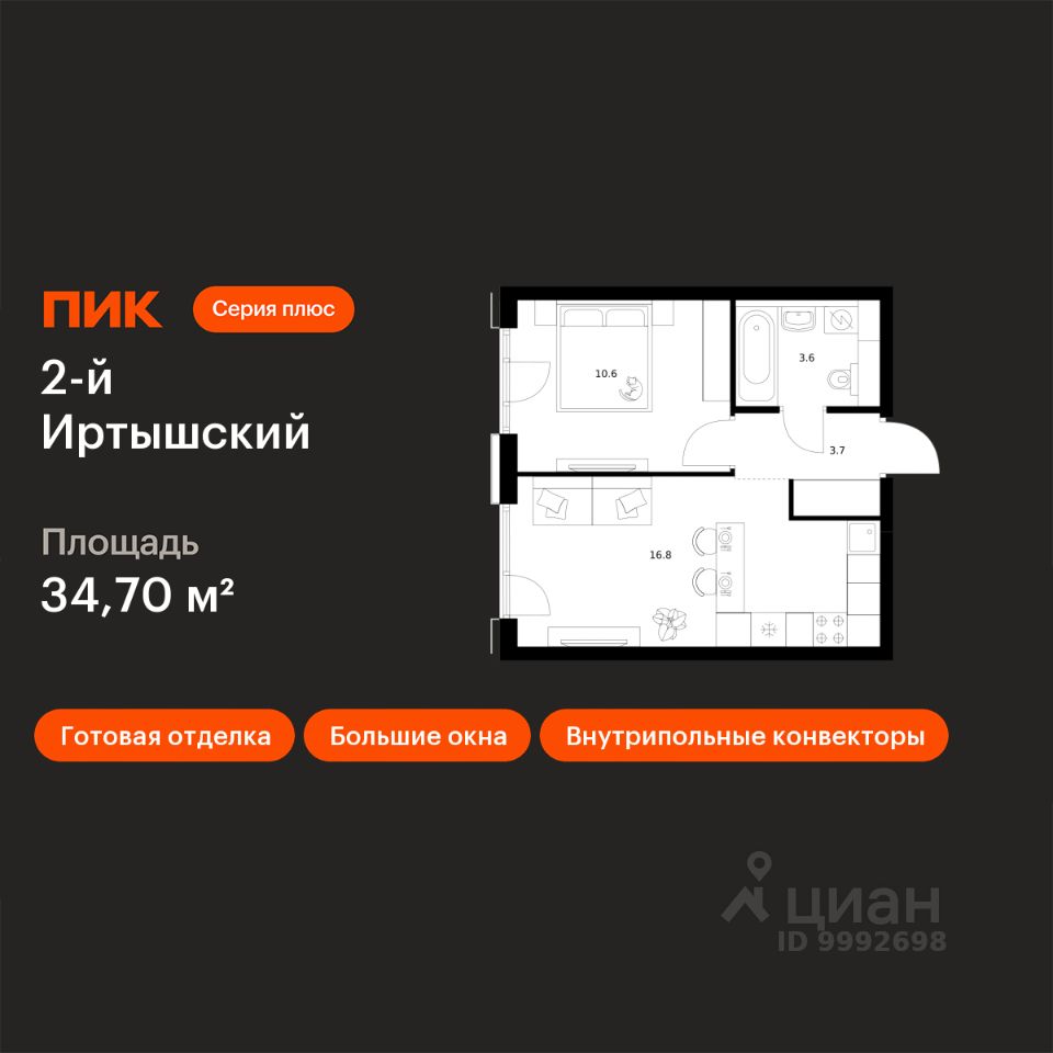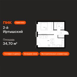 Продаётся 1-комн. квартира площадью 34,7 кв.м на 3 этаже 19 этажного дома (Корпус 1.2, Секция 2) проекта ПИК 2-й Иртышский. Светлый просторный подъезд на уровне земли, функциональная планировка, большие окна, c отделкой.
