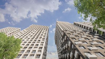 - Разноуровневые секции с эстетичные башнями и контрастными цветовыми сочетаниями, напоминающими башни в Сити.