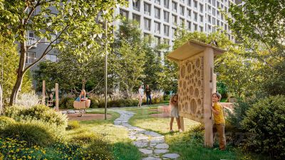Юных жителей порадуют современные детские площадки, жукарий и специальное пространство для подвижных игр.