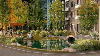 Чтобы отдохнуть от суеты города, достаточно выйти во двор: здесь раскинулся настоящий лес с живописными пейзажами. В тени деревьев жителей ждут пруд с мостиком и беседкой на берегу, тихие прогулочные аллеи, спортивная площадка и зоны для занятий йогой и бадминтоном на свежем воздухе.