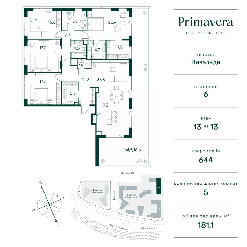 Клубный город на реке "Примавера" — это современный жилой комплекс премиум-класса, расположенный на первой береговой линии Москвы-реки в экологически чистом районе Покровское-Стрешнево. Под панорамными окнами квартир находится собственный экопарк с продуманной сетью прогулочных дорожек и современными детскими и спортивными площадками. За парком расположена набережная с собственным пляжем и зонами для отдыха. Клубный город на реке "Примавера" предлагает широкий выбор планировок для различных жизненных сценариев: от просторных однокомнатных квартир до пентхаусов и жилых помещений с террасами и патио. Выберите из 120 вариантов эргономичных планировок стандартного и евроформата. Из каждой квартиры открываются красивые виды на реку с углом обзора в 270 градусов. Дизайнерские лобби предлагают панорамный обзор на благоустроенный двор. Высокие потолки в 6 метров и качественная отделка создают атмосферу, схожую с пятизвездочными отелями. В "Примавера" есть всё необходимое для комфортной жизни в мегаполисе: • Образование для детей в шаговой доступности: 4 школы, 8 детских садов и развивающие центры с кружками и секциями. • Удобства на расстоянии приятной прогулки: супермаркеты, кафе, рестораны с верандами, салоны красоты, аптеки и многофункциональный центр для шоппинга и развлечений. • Умный дом: автоматизированное бесконтактное управление основными системами доступа и безопасности через мобильное приложение. Клубный город на реке "Примавера" выгодно сочетает комфорт городской жизни с близостью к природе. Живите в месте, где все создано для вашего удобства!