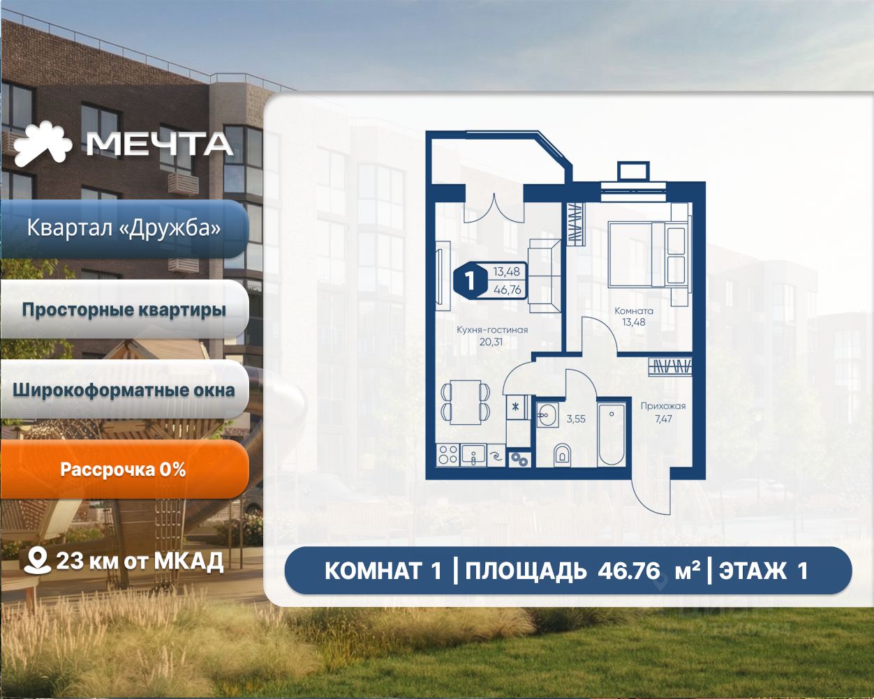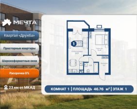 Продается однокомнатная квартира в квартале "Дружба" жилого комплекса "Мечта". Общая площадь квартиры: 46.76 кв. м, этаж 1 из 5.