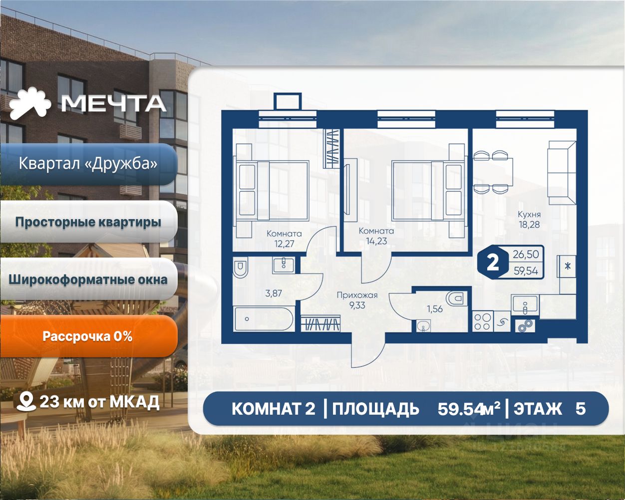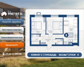 Продается двухкомнатная квартира в квартале "Дружба" жилого комплекса "Мечта". Общая площадь квартиры: 59.54 кв. м, этаж 5 из 5.