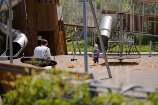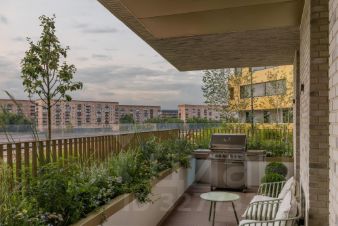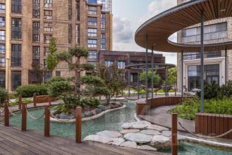 Квартал продуман до мелочей. В нём обустроен двор с газонами и прогулочными аллеями, видовыми площадками для отдыха с деревянными шезлонгами и перголами. Резиденты будут наслаждаться эффектной панорамой Москвы-реки с шестиметровой возвышенности стилобата.