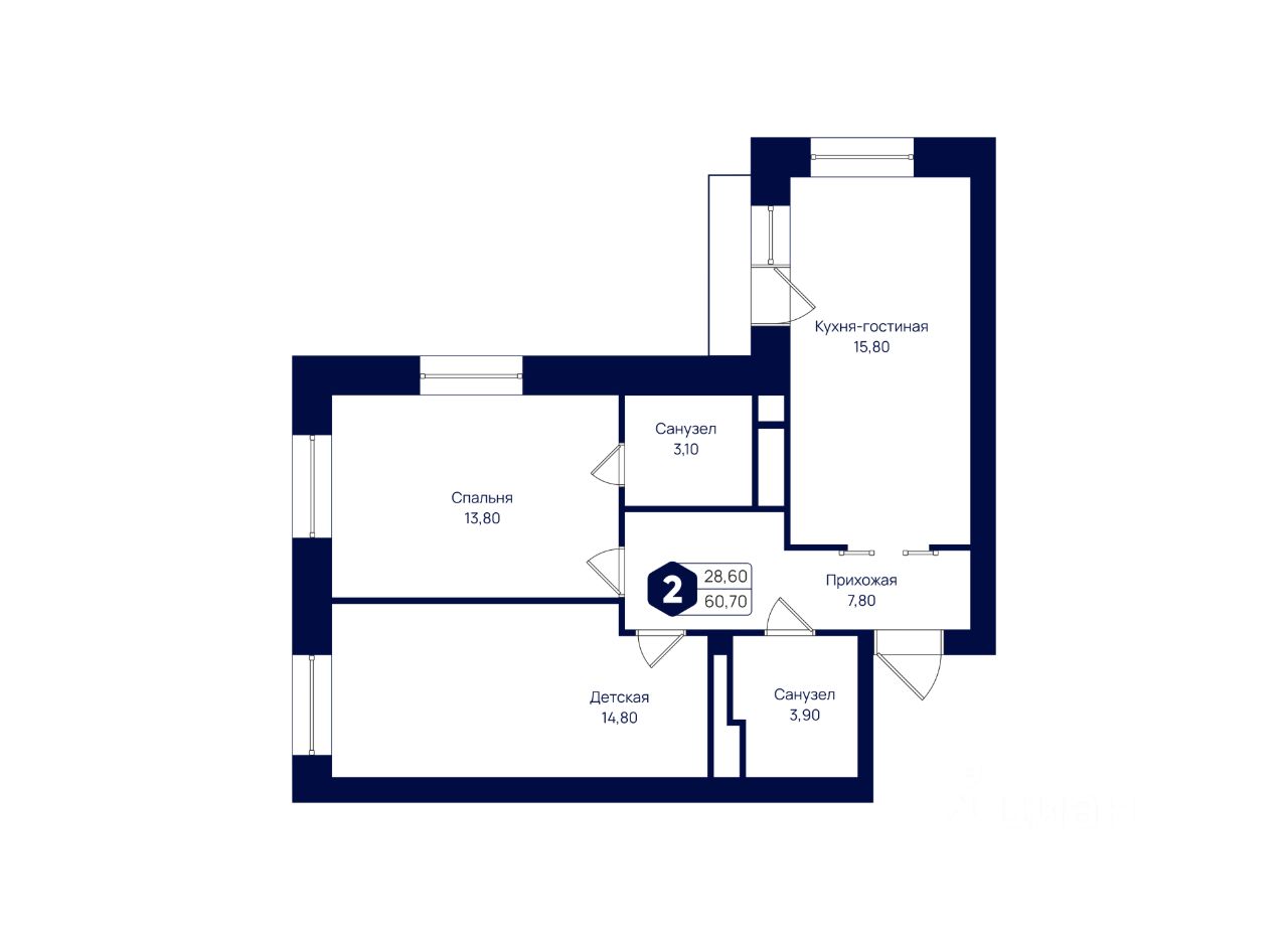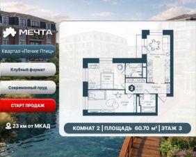 Продается двухкомнатная квартира в квартале "Пение птиц" жилого комплекса "Мечта". Общая площадь квартиры: 60.70 кв. м, этаж 3 из 3.