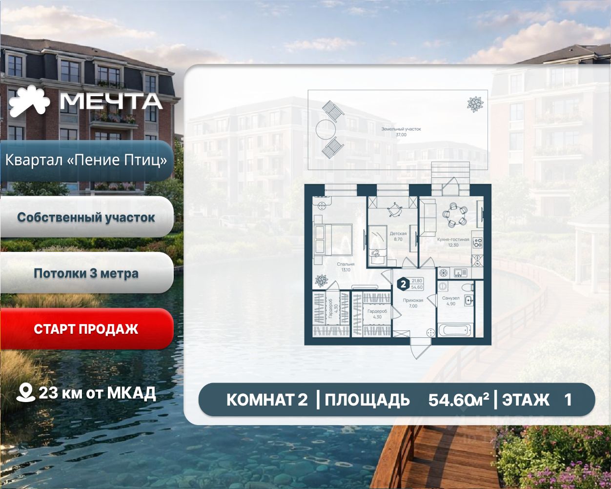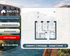 Продается двухкомнатная квартира в квартале "Пение птиц" жилого комплекса "Мечта". Общая площадь квартиры: 54.60 кв. м, этаж 1 из 3.