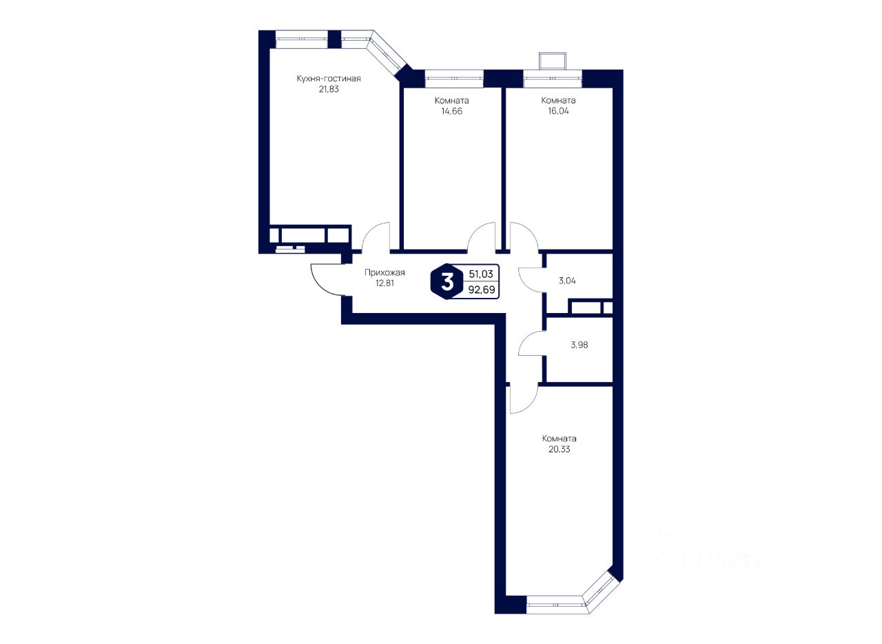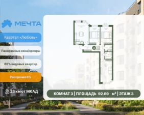 Продается трехкомнатная квартира в квартале "Любовь" жилого комплекса "Мечта". Общая площадь квартиры: 92.69 кв. м, этаж 3 из 5.