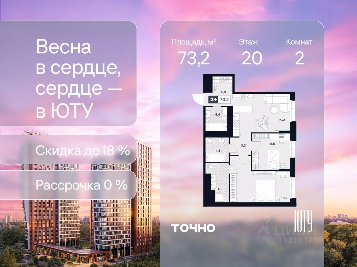 Скидка до 18% в апреле на выделенный пул лотов! ЮТУ — камерный проект бизнес-класса с исключительной архитектурой, видовыми квартирами и подходом к большой благоустроенной набережной канала имени Москвы. Проект создает идеальный баланс жизни в городе. Это приватный оазис, где в любой момент можно сменить обстановку и выбрать любой из тысячи маршрутов к активному отдыху и ярким впечатлениям. Удачное месторасположение: • Первая линия в прибрежной части Химкинского водохранилища • Исключительно тихий и зелёный район Южное Тушино • За 2 минуты можно спуститься к воде, за 10 минут найти зеленые парки и готовую инфраструктуру, за 30 минут доехать до Кремля Концепция проекта: • Две футуристичные башни, соединенные торговой галереей от бюро ATRIUM • 60 неповторяющихся планировок: квартиры с угловым панорамным остеклением, мастер-спальнями и гостиными до 39м², а также просторные квартиры площадью до 128,6 м² Чувство эксклюзивности: • Своя приватная жилая экосистема только для резидентов домов • Лаунж-терраса на крыше • В проекте предусмотрен закрытый двор-парк. Прогрессивные технологии: • 3-х уровневая система безопасности (Face ID, BLE-метки, видеонаблюдение) • Умный паркинг с распознаванием номеров Проект федерального девелопера ТОЧНО, который входит в ТОП-5 девелоперов России по объемам строительства.