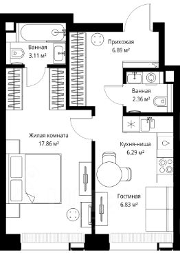 Продаётся 1-комнатная квартира общей площадью 43.34 м² без отделки в ЖК Веер на 11-м этаже 70 этажного дома.