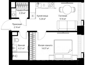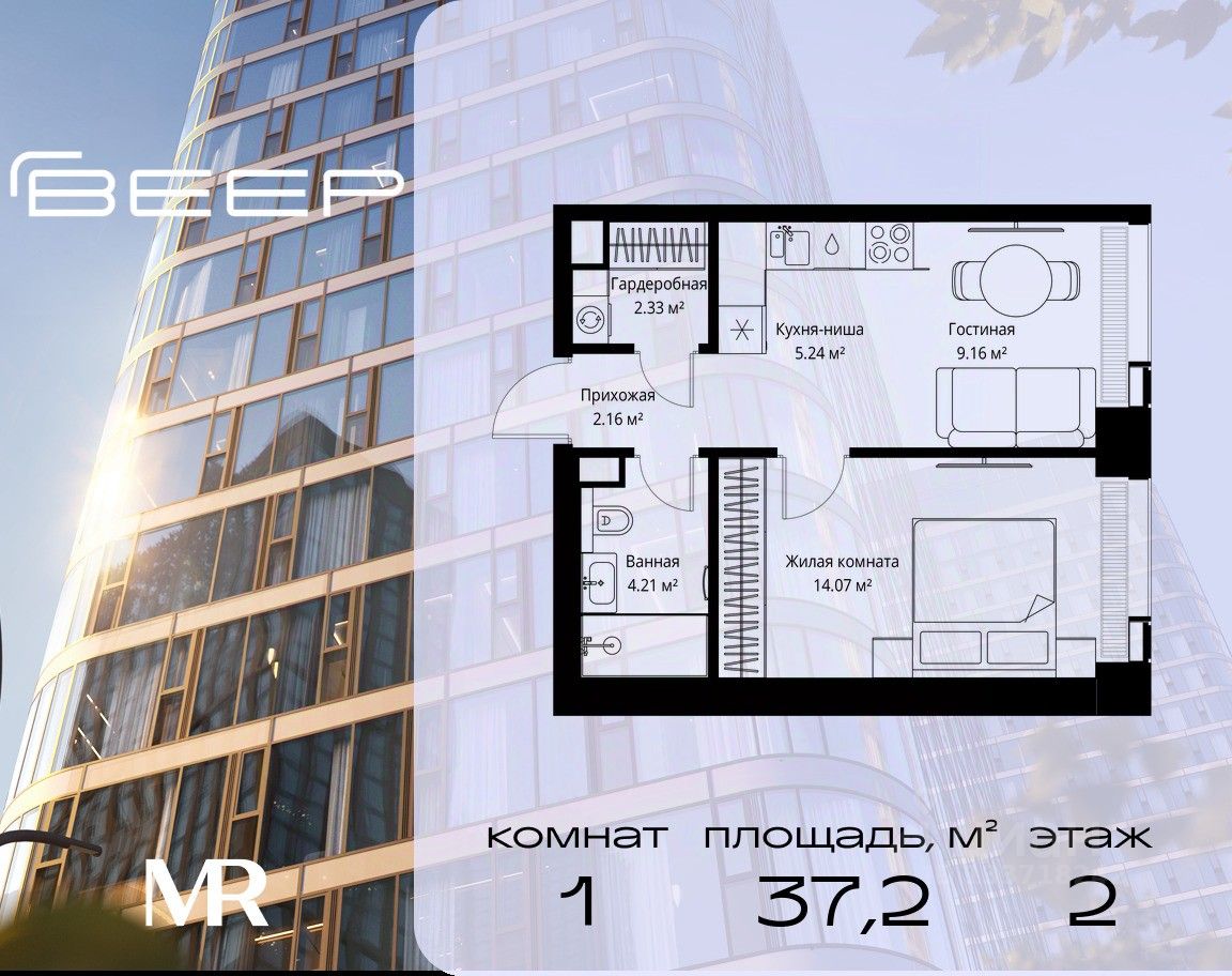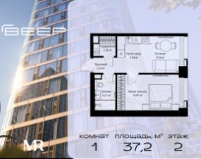 Продаётся 1-комнатная квартира общей площадью 37.17 м² без отделки в ЖК Веер на 2-м этаже 70 этажного дома.