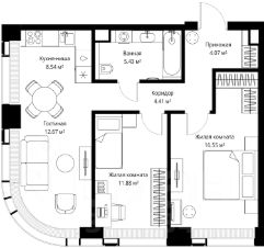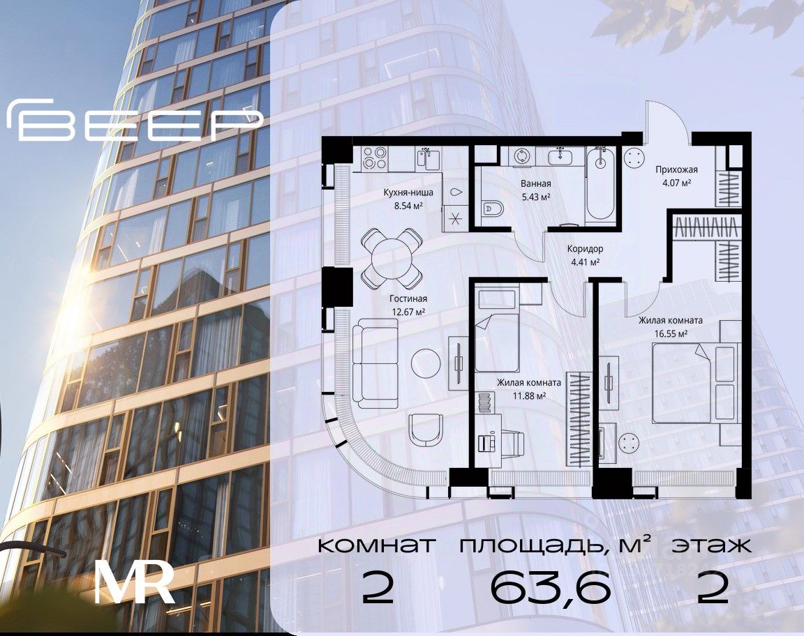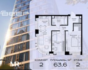 Продаётся 2-комнатная квартира общей площадью 63.55 м² без отделки в ЖК Веер на 2-м этаже 70 этажного дома.
