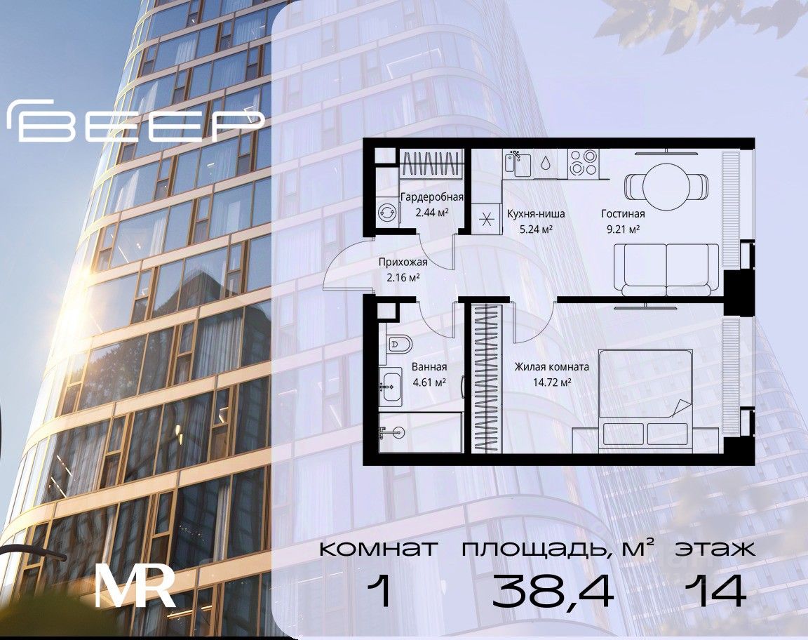 Продаётся 1-комнатная квартира общей площадью 38.38 м² без отделки в ЖК Веер на 14-м этаже 70 этажного дома.
