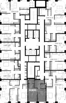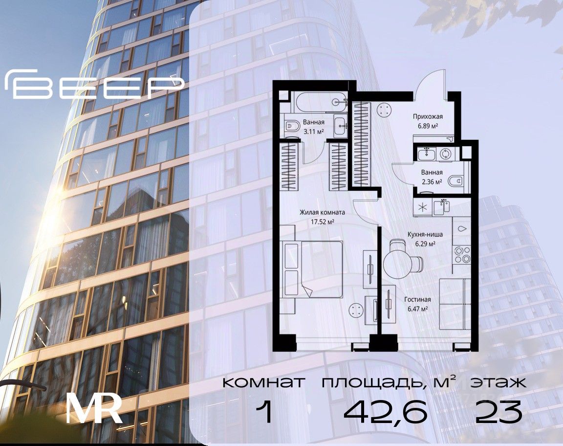 Продаётся 1-комнатная квартира общей площадью 42.64 м² без отделки в ЖК Веер на 23-м этаже 70 этажного дома.