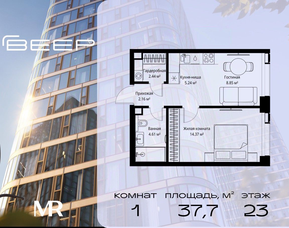 Продаётся 1-комнатная квартира общей площадью 37.67 м² без отделки в ЖК Веер на 23-м этаже 70 этажного дома.