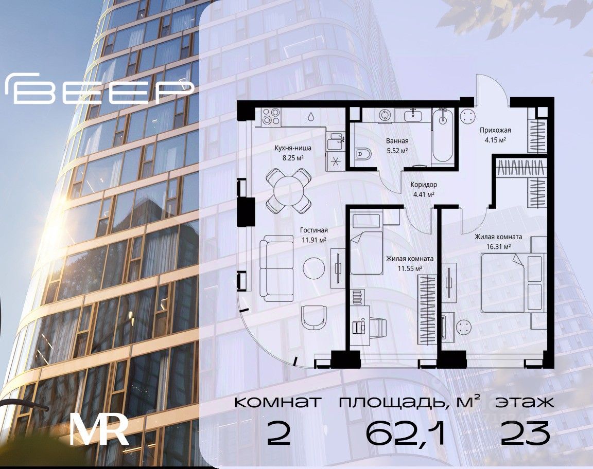 Продаётся 2-комнатная квартира общей площадью 62.10 м² без отделки в ЖК Веер на 23-м этаже 70 этажного дома.