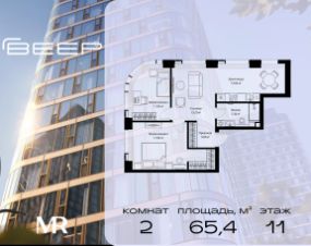Продаётся 2-комнатная квартира общей площадью 65.42 м² без отделки в ЖК Веер на 11-м этаже 70 этажного дома.