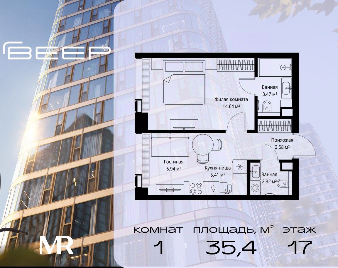 Продаётся 1-комнатная квартира общей площадью 35.36 м² без отделки в ЖК Веер на 17-м этаже 70 этажного дома.