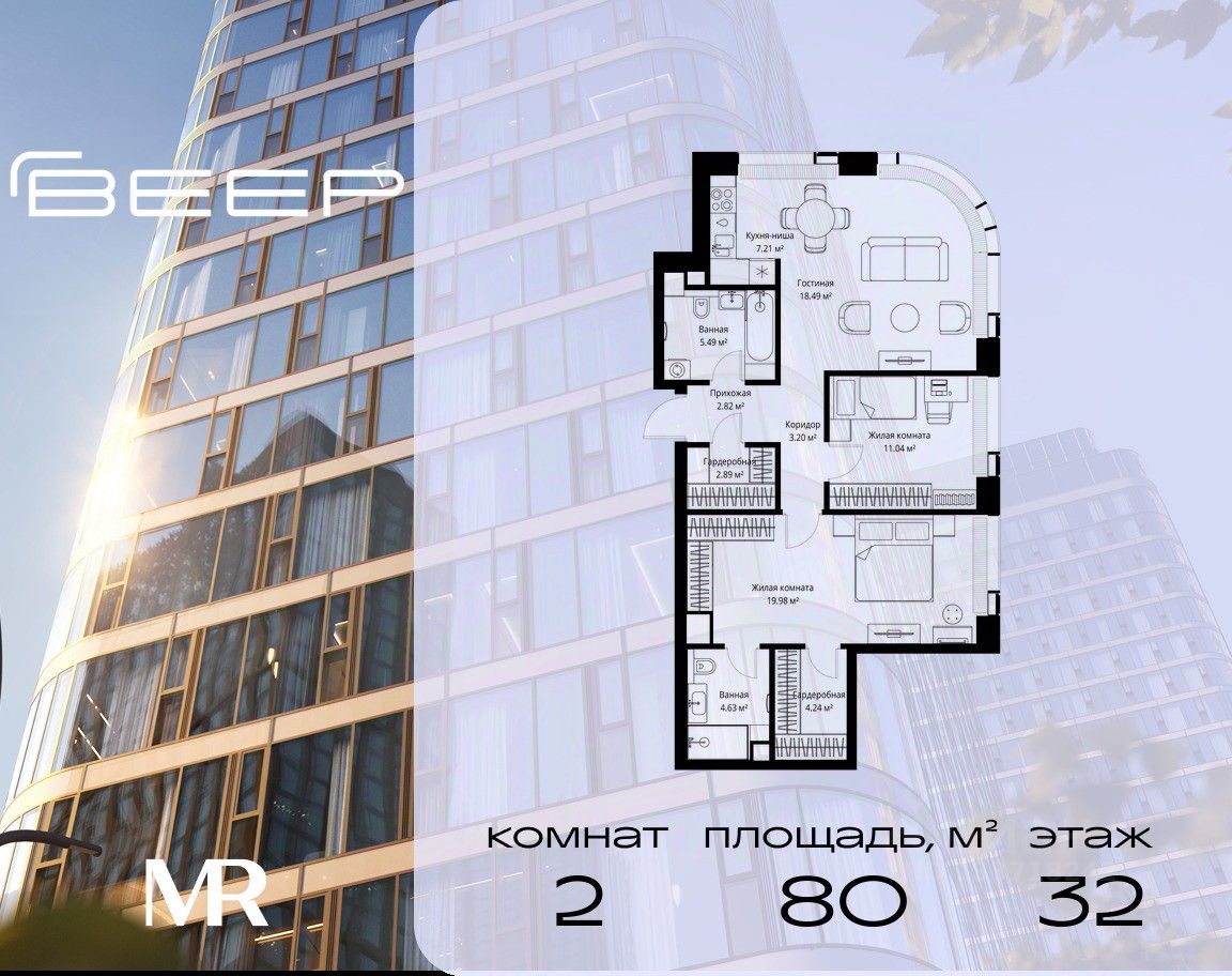 Продаётся 2-комнатная квартира общей площадью 79.99 м² без отделки в ЖК Веер на 32-м этаже 70 этажного дома.