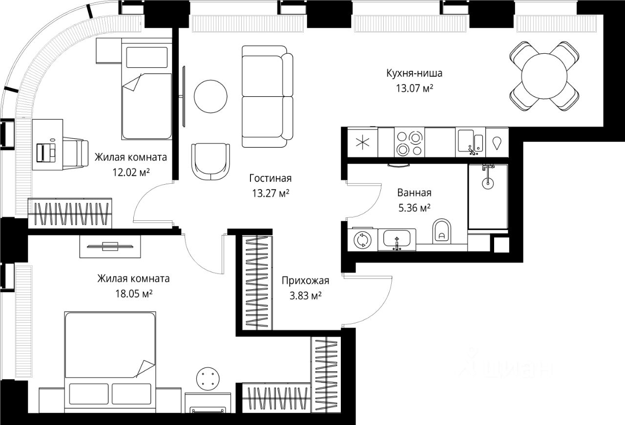 Продаётся 2-комнатная квартира общей площадью 65.60 м² без отделки в ЖК Веер на 26-м этаже 70 этажного дома.
