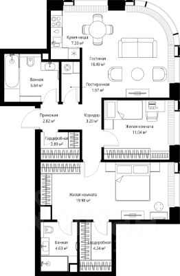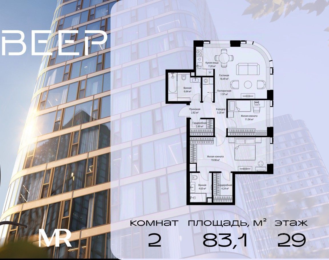 Продаётся 2-комнатная квартира общей площадью 83.10 м² без отделки в ЖК Веер на 29-м этаже 70 этажного дома.