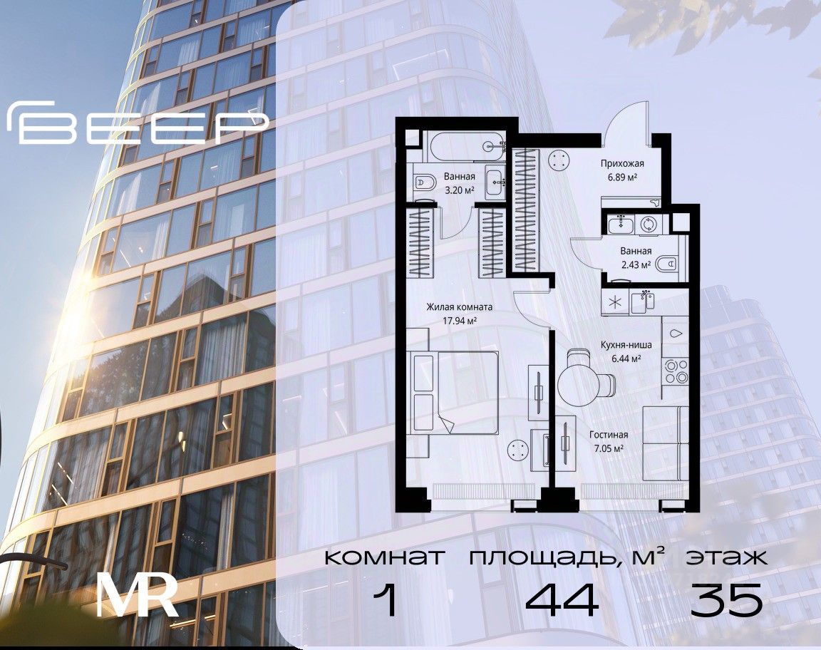 Продаётся 1-комнатная квартира общей площадью 43.95 м² без отделки в ЖК Веер на 35-м этаже 70 этажного дома.