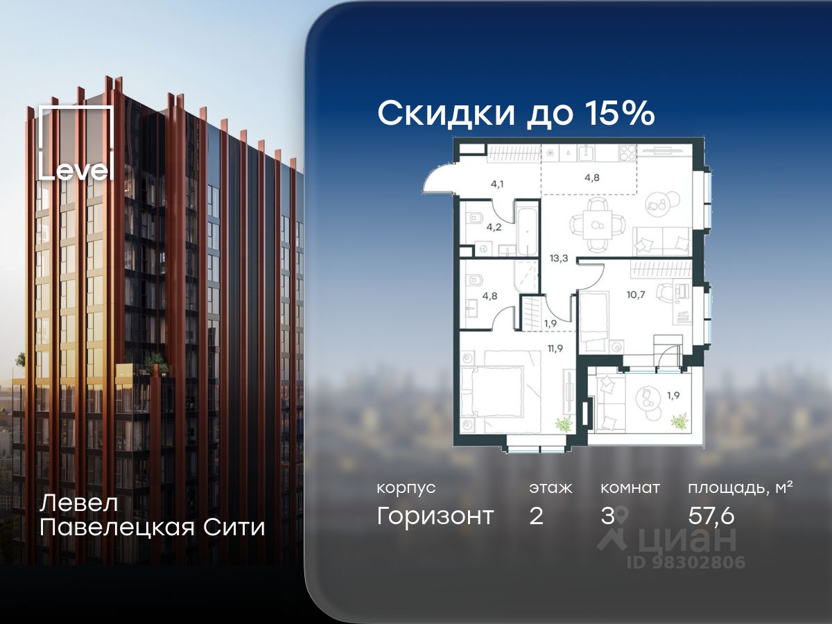 В Даниловском районе столицы (ЮАО) продаётся 3-комнатная квартира площадью 57.60 кв.м без отделки. Квартира расположена на 2 этаже 20-этажного корпуса 13 в жилом комплексе бизнес-класса Левел Павелецкая Сити. Высота потолков 3.00м.