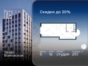 Продается студия площадью 29.10 кв. м без отделки. Квартира находится на 16 этаже 20-этажного корпуса 5, в новом жилом комплексе бизнес-класса Левел Войковская, расположенном рядом с живописным заповедником "Покровское-Стрешнево" (застройщик - компания Level Group/Левел групп).