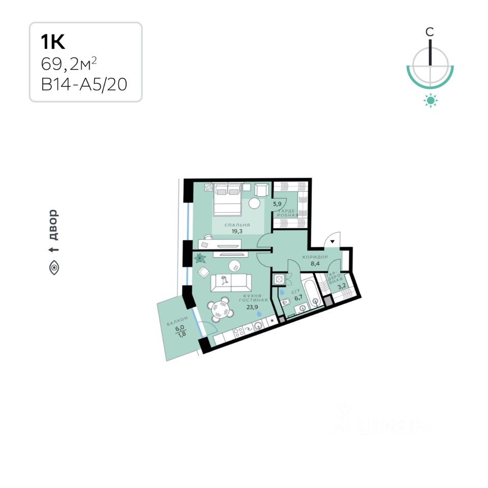 В продаже — однокомнатная квартира с чистовой отделкой, общей площадью 69,2 кв. м. Квартира расположена на шестом этаже тринадцатиэтажного корпуса Адвансд в квартале В14 нового района СберСити, который строит Сбер. Дом расположен на первой береговой линии Москвы-реки.