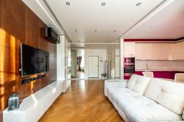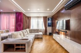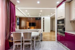 - Очень хорошее состояние квартиры, дизайнерский ремонт с использованием премиальных материалов делался для себя. На полу паркетная доска, стена в гостиной отделана деревом - дуб. На стенах влагостойкая немецкая краска. Итальянская мозаичная плитка в ванной и кухне (фартук). Дорогие межкомнатные двери, дорогие шторы.