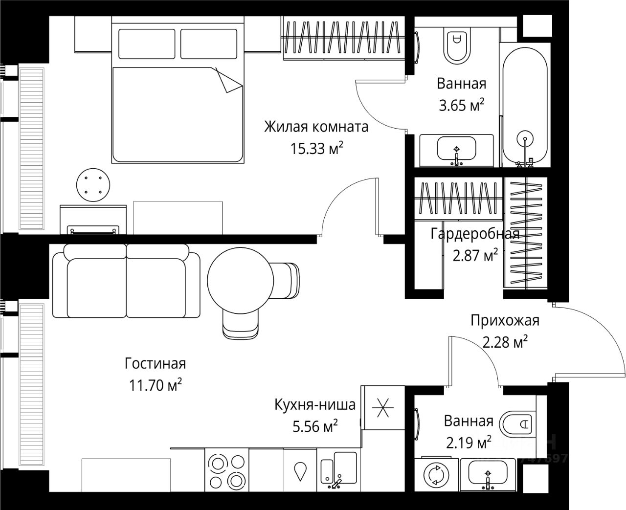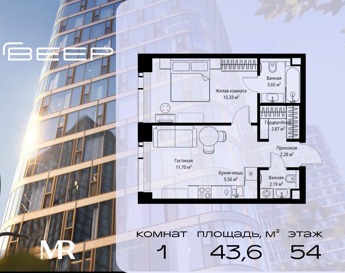 Продаётся 1-комнатная квартира общей площадью 43.58 м² без отделки в ЖК Веер на 54-м этаже 70 этажного дома.