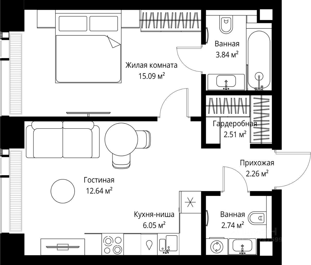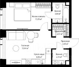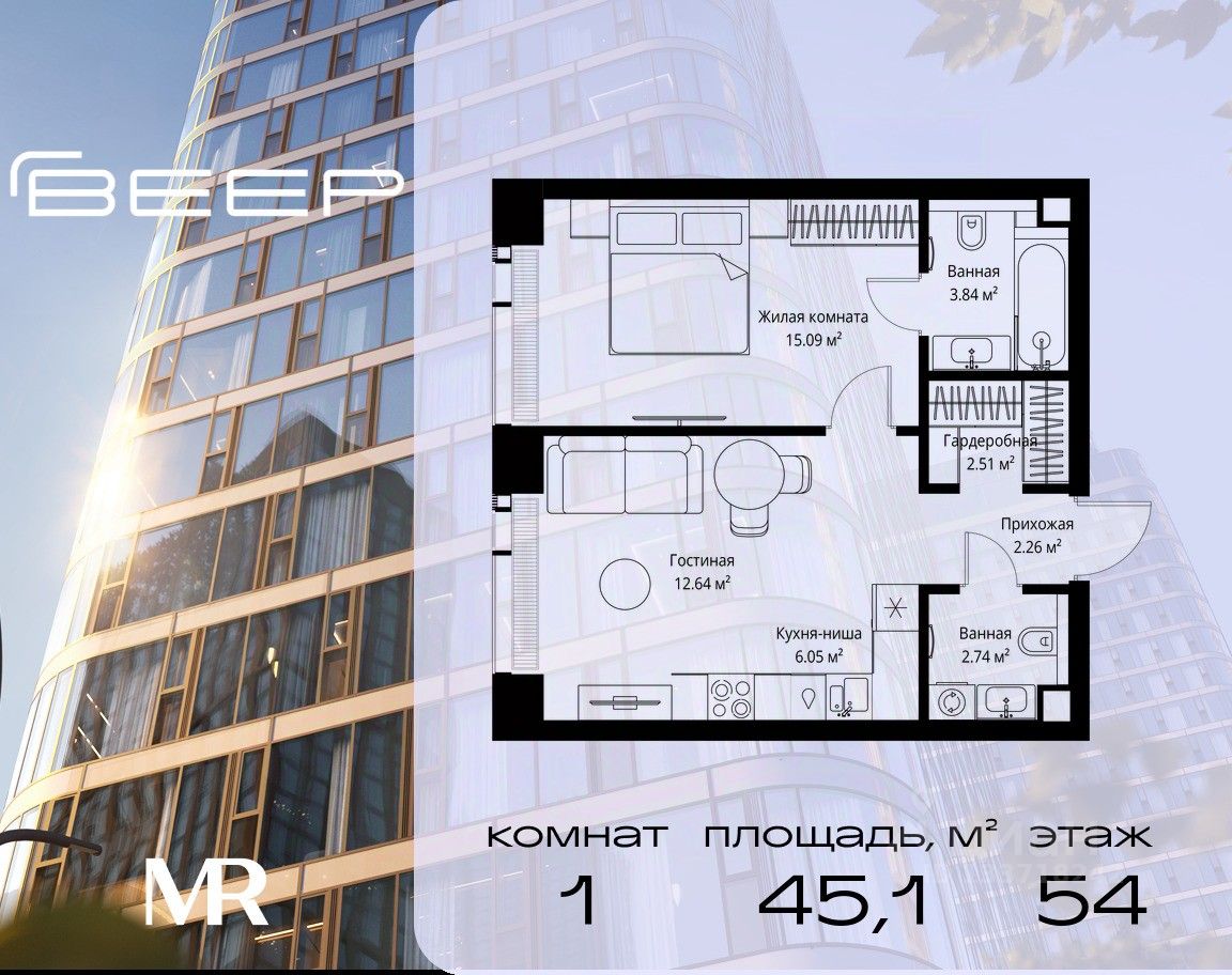 Продаётся 1-комнатная квартира общей площадью 45.13 м² без отделки в ЖК Веер на 54-м этаже 70 этажного дома.