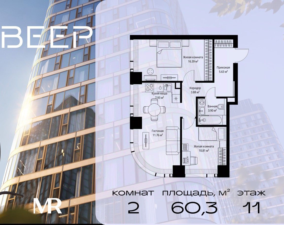 Продаётся 2-комнатная квартира общей площадью 60.30 м² без отделки в ЖК Веер на 11-м этаже 70 этажного дома.